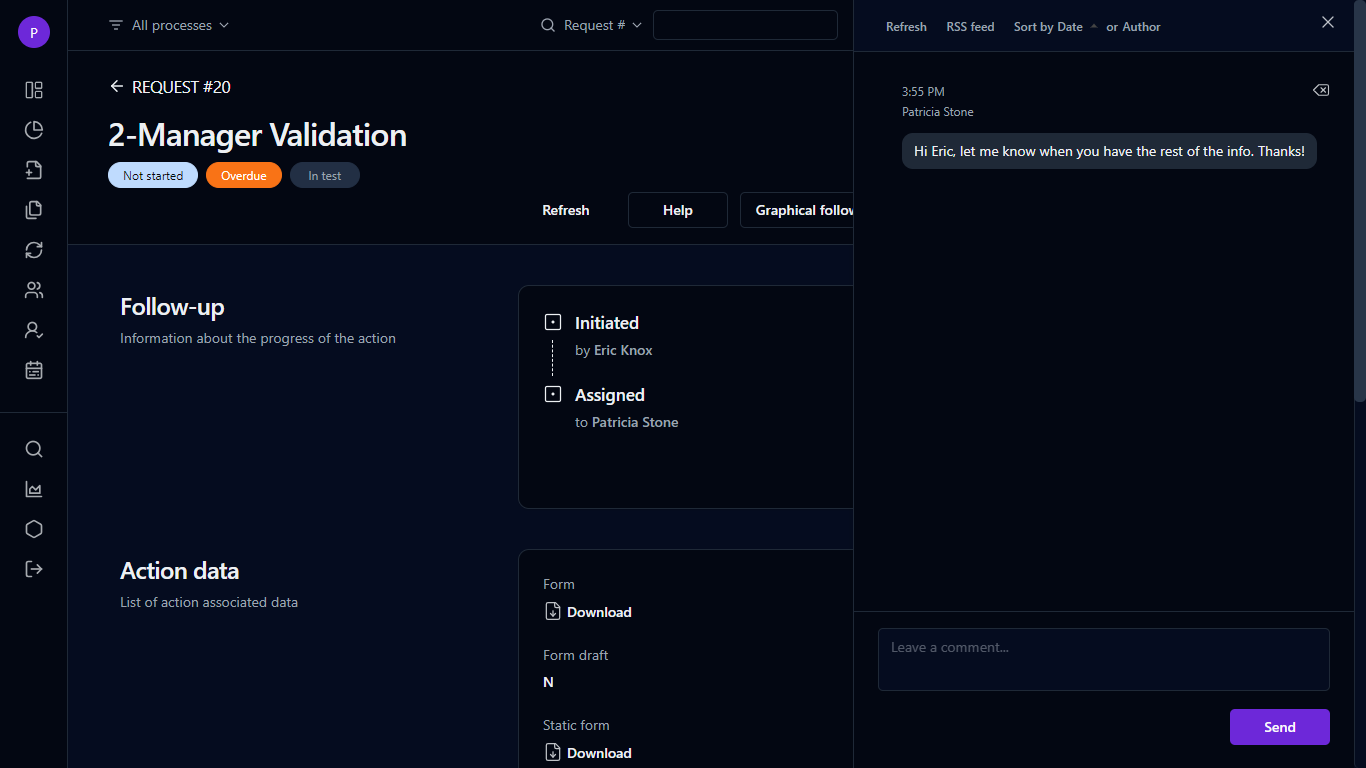 A slide-out panel on the right allows the participants of the request to post free-form comments.