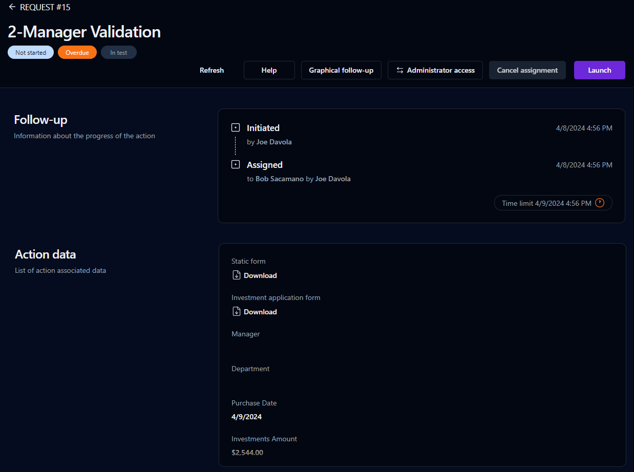 An action with the Self-service assignment method can be launched by a participant if the action has not been accepted or assigned.