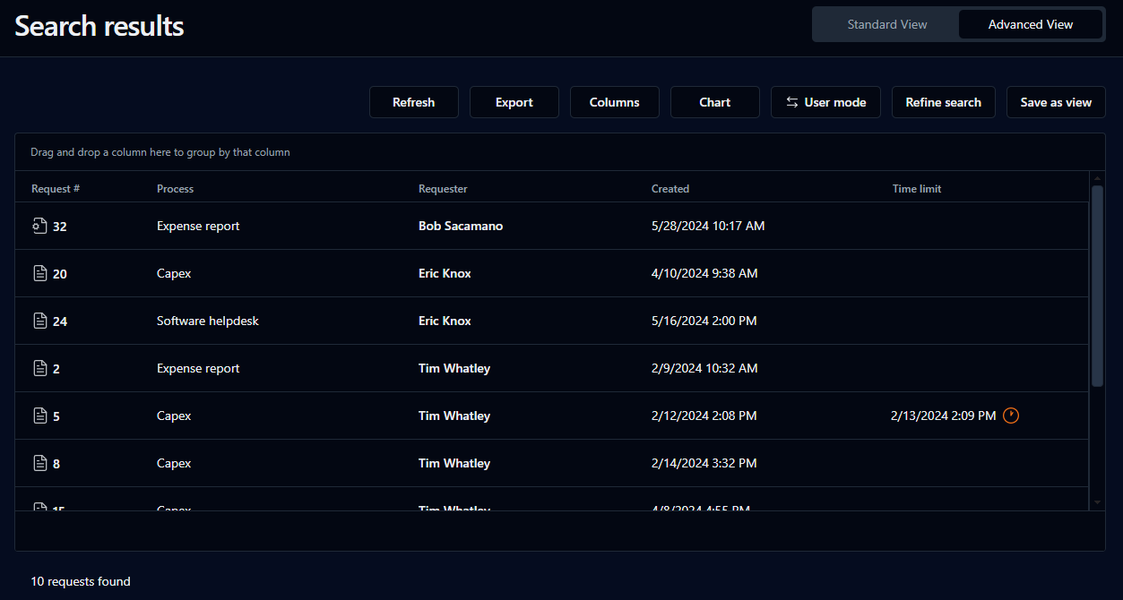 If you're an administrator, you can access the list of current requests or overdue requests for all processes. You can save the current view of the list of requests.