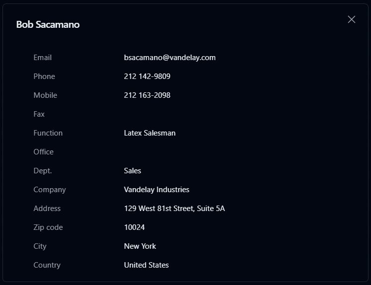 Clicking the name of a user displays their calling card, which contains information defined in their user profile.
