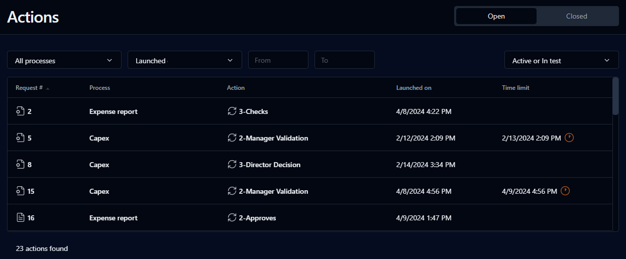 By default, clicking the action name launches the action, but you can configure WorkflowGen in order to change this behavior and display the action follow-up form instead of launching the action.
