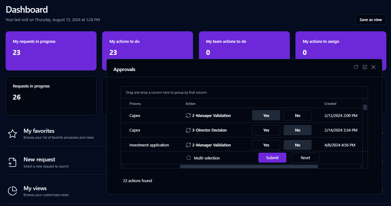To take full advantage of the Quick approval feature, you can then display the saved view as a pop-up panel on your Dashboard (see Dashboard pop-up panels). Whenever you return to or reload your Dashboard, the list will refresh automatically, and you can handle your approvals directly in the pop-up panel using the buttons.