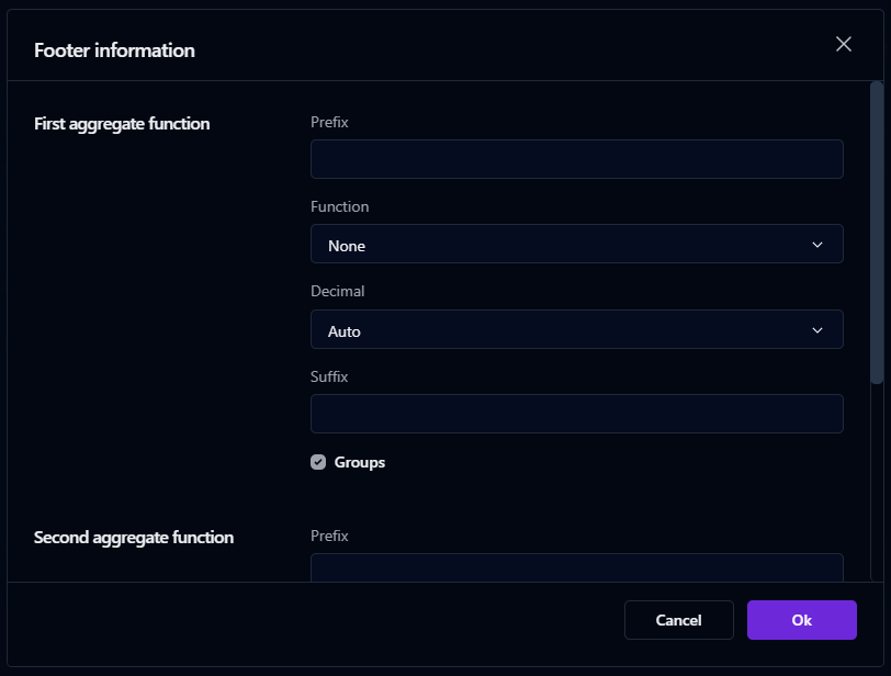 Hover the mouse over the column footer, then click it to open the Footer information window. From this window you can add various types of information, such as average, minimum and maximum values, etc.