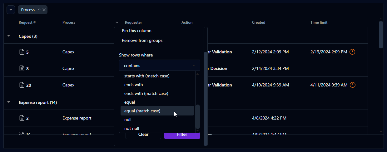 To filter by column, hover over a column header and click the pencil icon that appears on the right to open a drop-down panel. In the Show rows where section, you can filter by combinations of keywords or number configurations, depending on whether you're filtering text or numeric information.