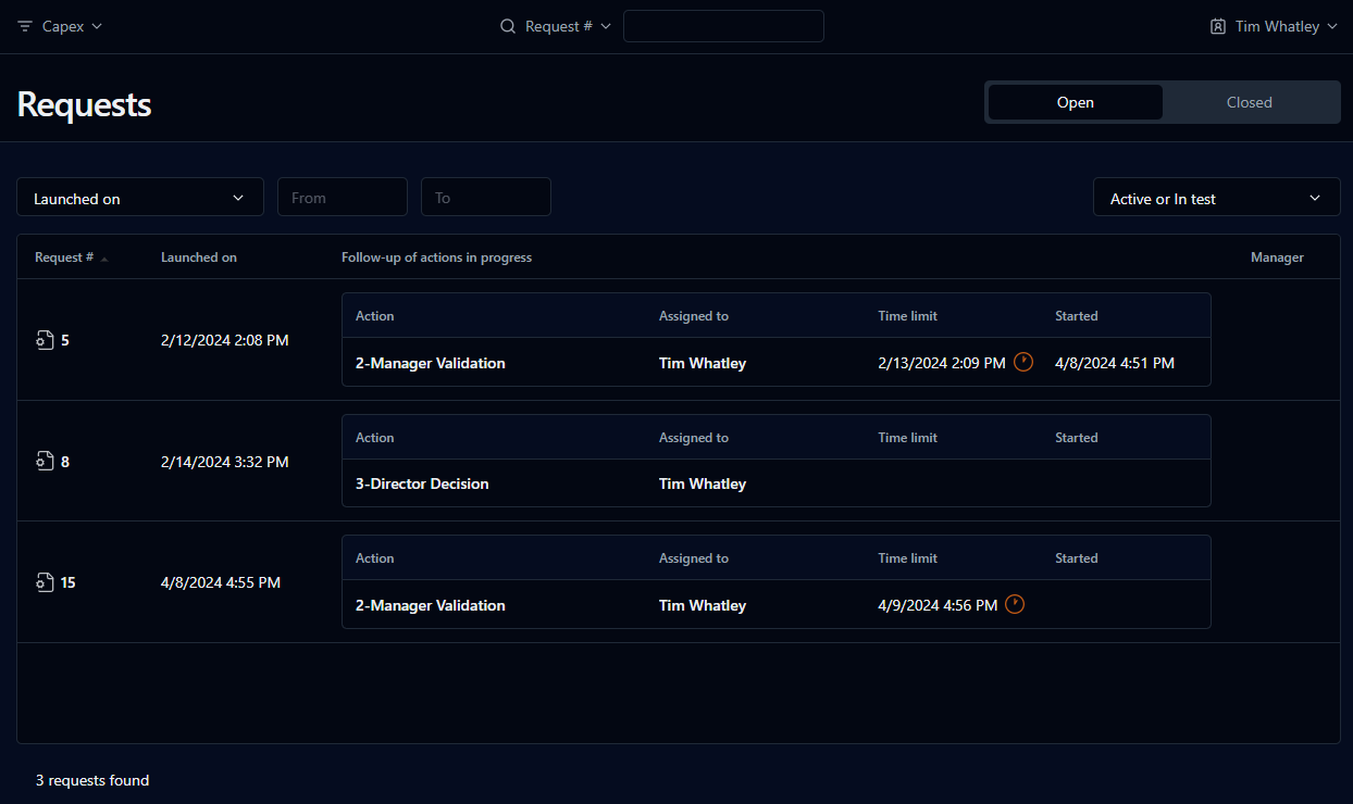 Opens the Requests screen, which contains a list of ongoing and closed requests that you've launched