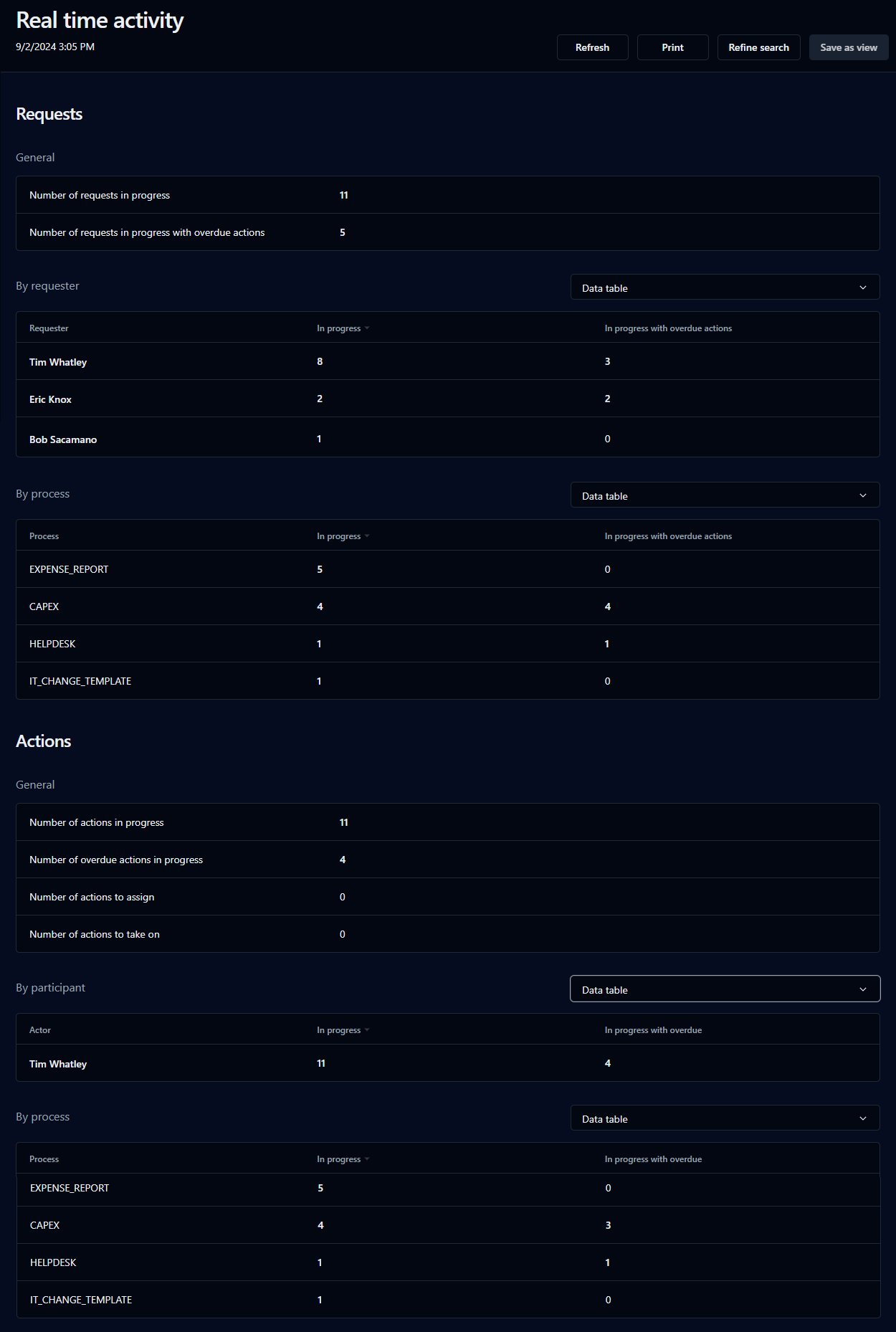 Activity analytics that provide views of the various requests and actions in real time or during a specified time period