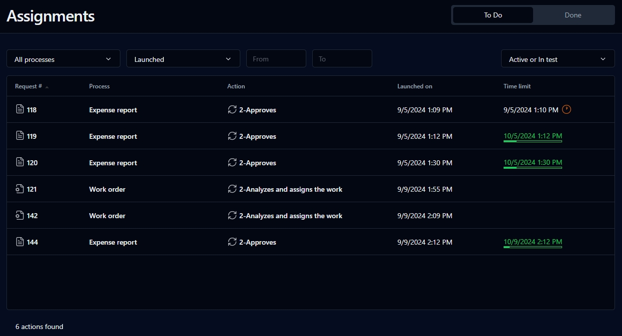 User-selected deadline date range for the action to be assigned (click the fields to display a calendar date picker)