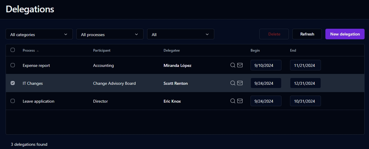 To add a new delegation, click the New delegation button. From the drop-down lists, choose All processes and All participants or a specific process and participant. Then, click on the