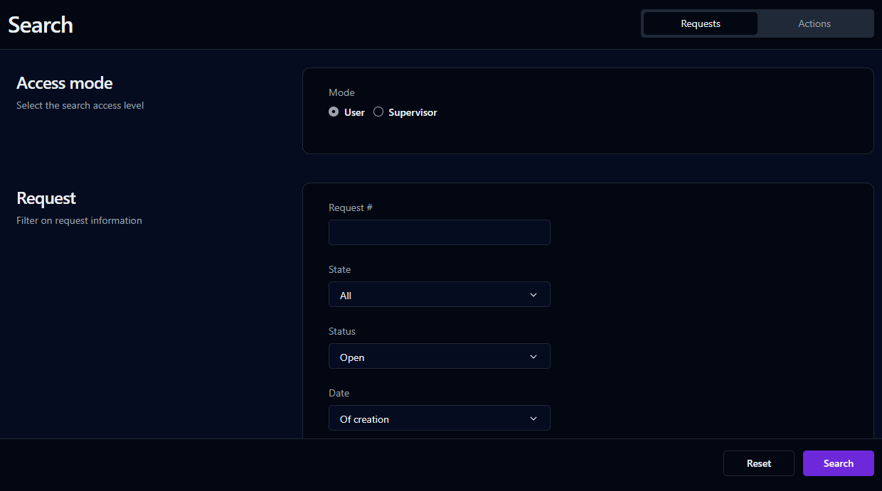 Click Requests to search requests or Actions to search actions. The search form is in User mode by default and includes the following search filters: