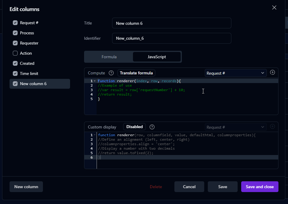 The JavaScript tab allows you to write JavaScript functions in order to calculate the values of your custom columns.