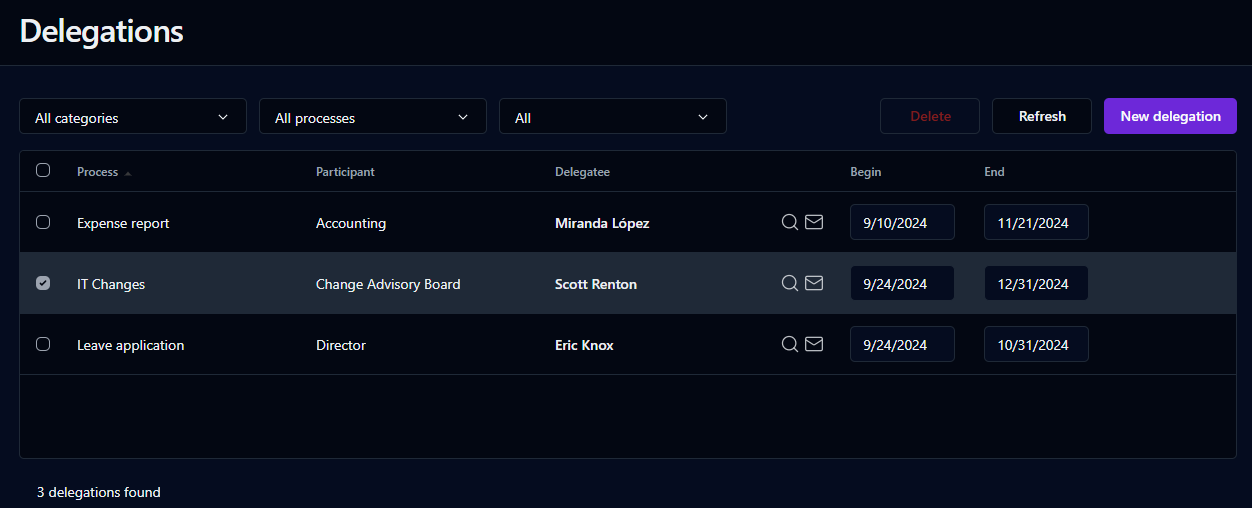 icon to select and define the delegatee. The new delegation will automatically be saved after selecting a delegated user. At any time before choosing a delegate, you can cancel the new delegation by clicking on the Cancel button on the right side of the row.