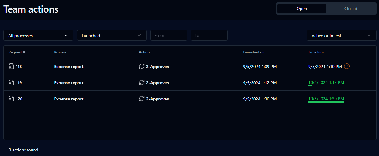 This page displays your team actions to do and the team actions you've closed. These are actions that have been defined with the Self-service assignment method.