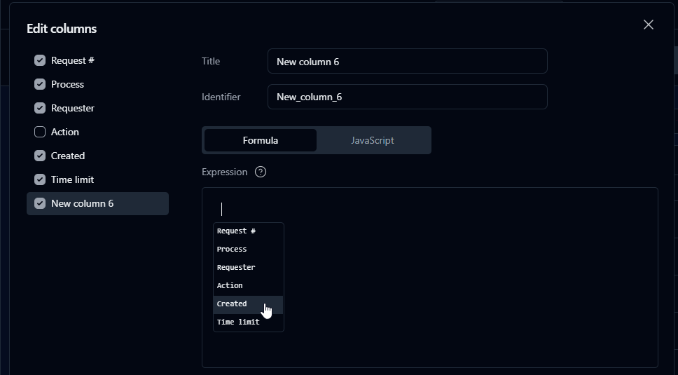 The Formula tab allows you to easily enter column information by clicking inside the Expression editor and entering information or selecting from the list of existing columns displayed.