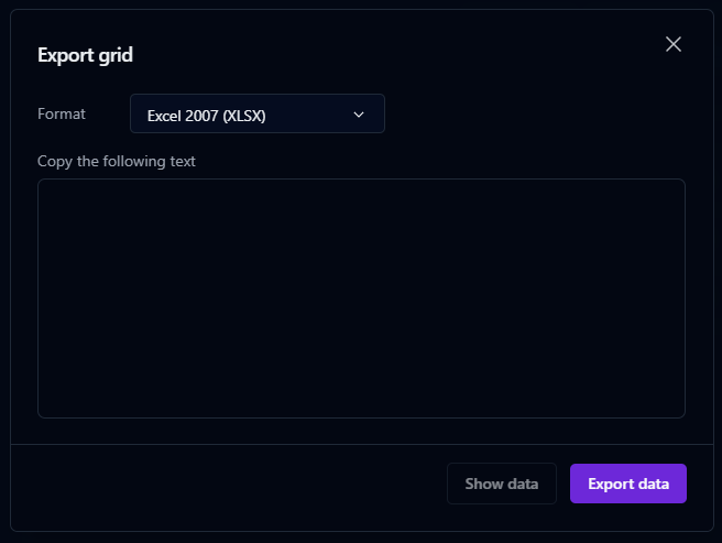 You can export your search results by clicking the Export button located above the column grid. This allows you to export the search data as a downloadable file in a number of formats (Excel 2007 (XLSX), Excel (XLS), XML, CVS, HTML, JSON, TSV), or inside the Copy the following text box, where you can copy the content to another location by clicking the Show data button (not supported by XLSX format).