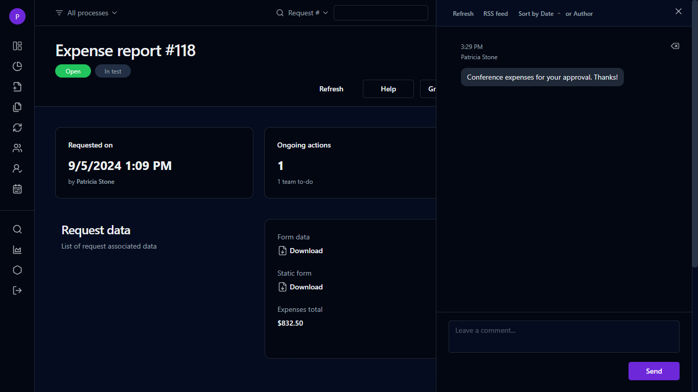 Click in the top right corner of the screen to open a slide-out panel where request participants can post free-form comments. Here, you can: