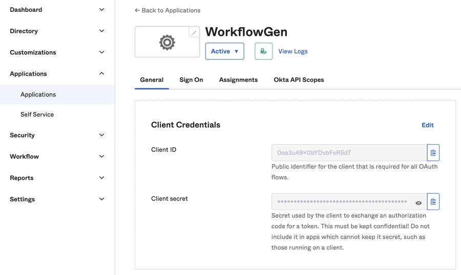 Chaque fournisseur d'identité génère un code qui identifie de manière unique votre application. Dans ce cas, il s'agit du code qui identifie de manière unique l'application Web WorkflowGen.