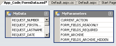 Notez, cependant, que si vous n'utilisez pas le nom Table1 pour le DataTable, vous devez utiliser le paramètre PARAMS_XPATH dans toutes vos actions pour indiquer à EFORMASPX et WorkflowPage où ils doivent localiser les paramètres et les données du formulaire. Ce paramètre est un XPath qui pointe vers cette table. Si vous nommez votre DataSet MyFormData et que vous nommez votre table par défaut MyParameters, le paramètre PARAMS_XPATH doit contenir MyFormData/MyParameters, sinon votre processus ne fonctionnera pas.