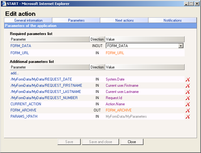 Notez que si vous utilisez des expressions XPath personnalisées pour vos noms de paramètres d'action, vous devrez également télécharger un FORM_DATA personnalisé dans votre processus qui contient des nœuds vides pour ces paramètres.